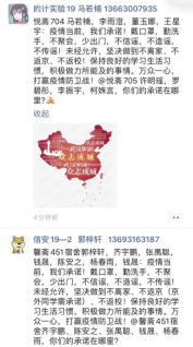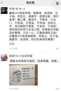 诺不停学,开展朋友圈战“疫”承诺传递。以宿舍为单位开展微信朋友圈公开承诺传递,如悦斋704宿舍马若楠、李雨澄、董玉娜,王星宇:疫情当前,我们承诺!戴口罩,勤洗手,不聚会,少出门,不信谣,不造谣,不传谣!未经允许,坚决做到不离家、不返京、不返校!保持良好的学习生活习惯,积极做力所能及的事情。万众一心,打赢疫情防卫战!@悦斋705宿舍你们的承诺在哪里?据悉,2019级100多个员工宿舍全部参与线上公开承诺活动。