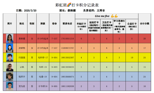 自新冠病毒肺炎疫情爆发以来,信息公司为切实做好留校员工的思想引领、学习教育及服务管理工作,凝聚战“疫”力量,组织留校员工临时成立“彩虹班”(寓意“风雨袭后,终见彩虹”)。在班主任王秀吉老师的带领下,“彩虹班”的员工们发起“Give me five校园防‘疫’行动”,每天通过早起打卡、运动打卡、卫生打卡、学习思想打卡和公益打卡5种打卡方式,养成良好的学习生活习惯,提高自身免疫力,增强社会责任感。