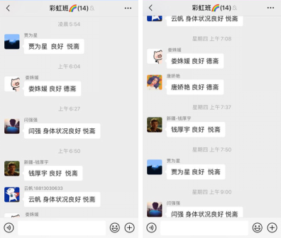 Five之“早起打卡”——“彩虹班”所有同学每天上午9:00前在班级群中进行打卡,并报告健康状况和所在位置,通过班级同学互相监督,养成良好的作息习惯,每天更加精力充沛的学习工作。
