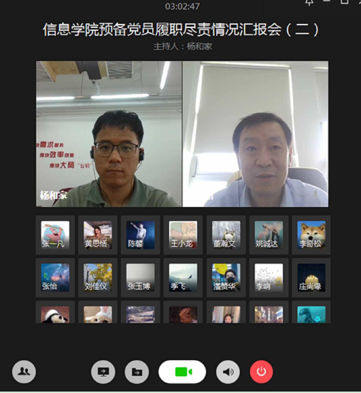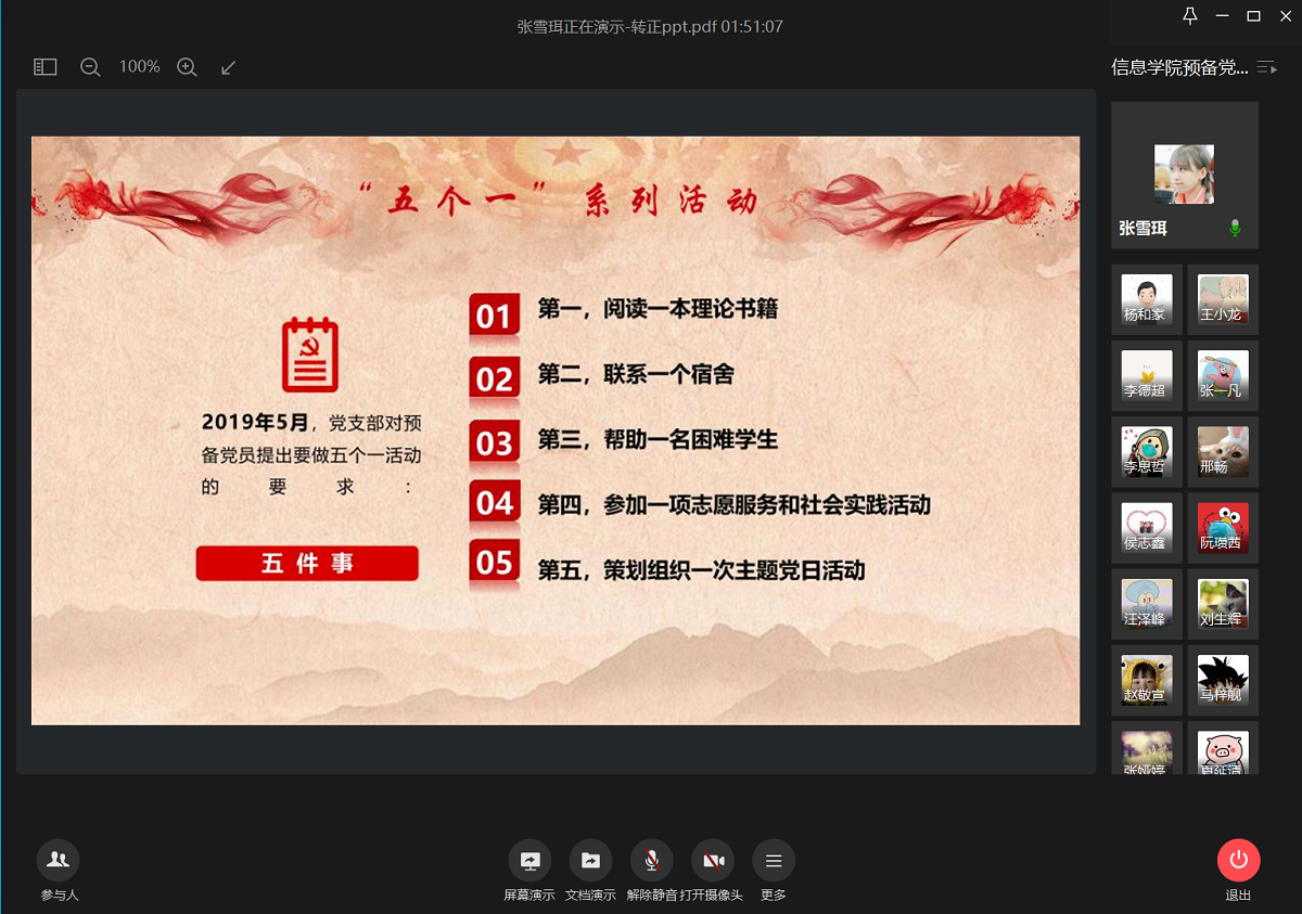 为加强对预备党员的教育和管理,综合考察预备党员一年预备期期间先锋模范作用的发挥,信息公司党委于5月21日和22日下午在企业微信召开了两场“预备党员履职尽责情况汇报会”。公司党委委员、支部书记、员工党建中心成员对63名预备党员在预备党员期内的履职尽责情况进行了考核评价。会议由公司员工党建中心副主任杨和家主持。