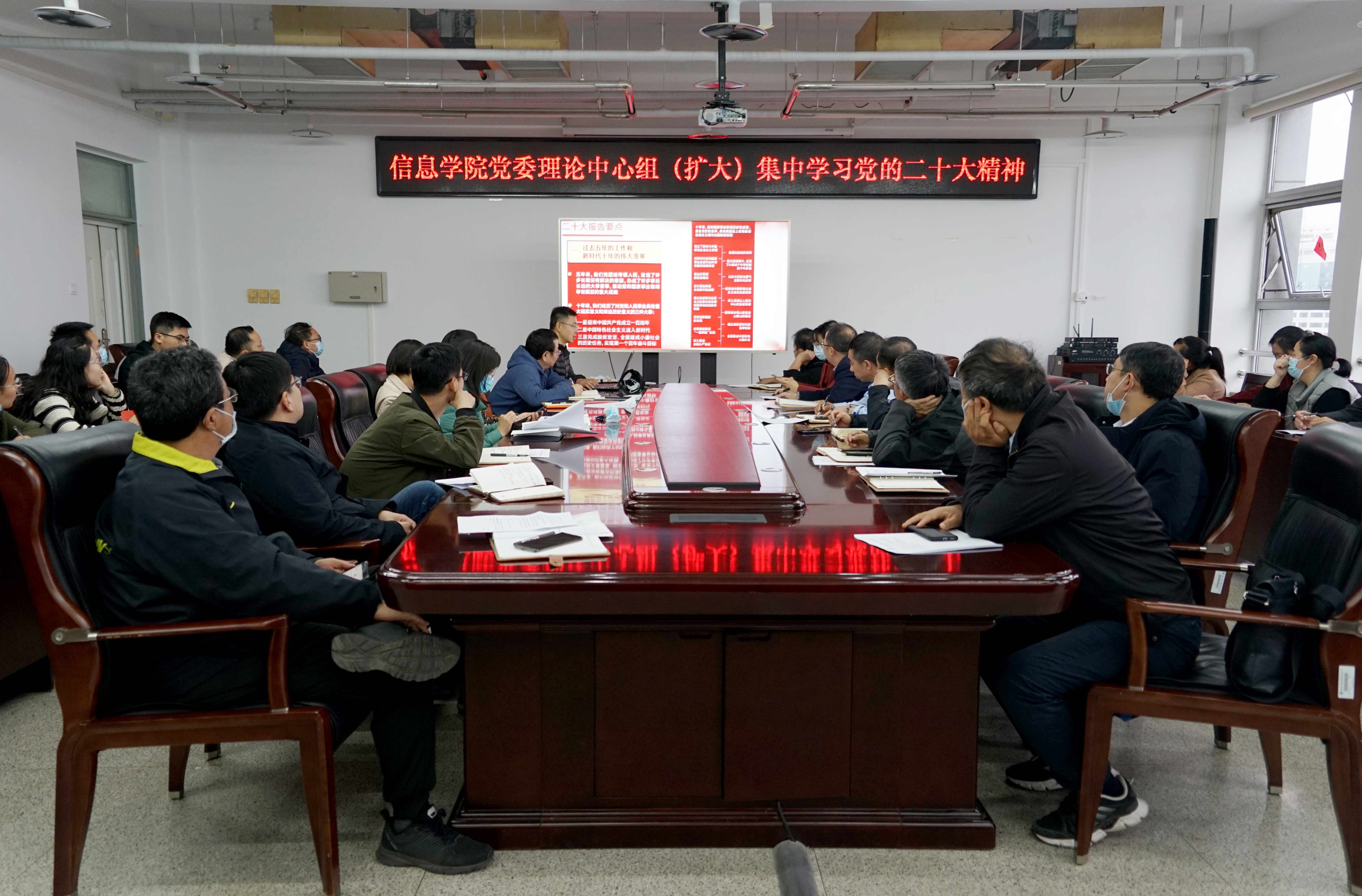 10月27日,信息公司党委理论学习中心组(扩大)在瀚学楼1014召开学习会,集中学习党的二十大报告,公司党委书记王月海主持会议并进行领学。公司党委委员、系主任、党支部书记参加了学习。