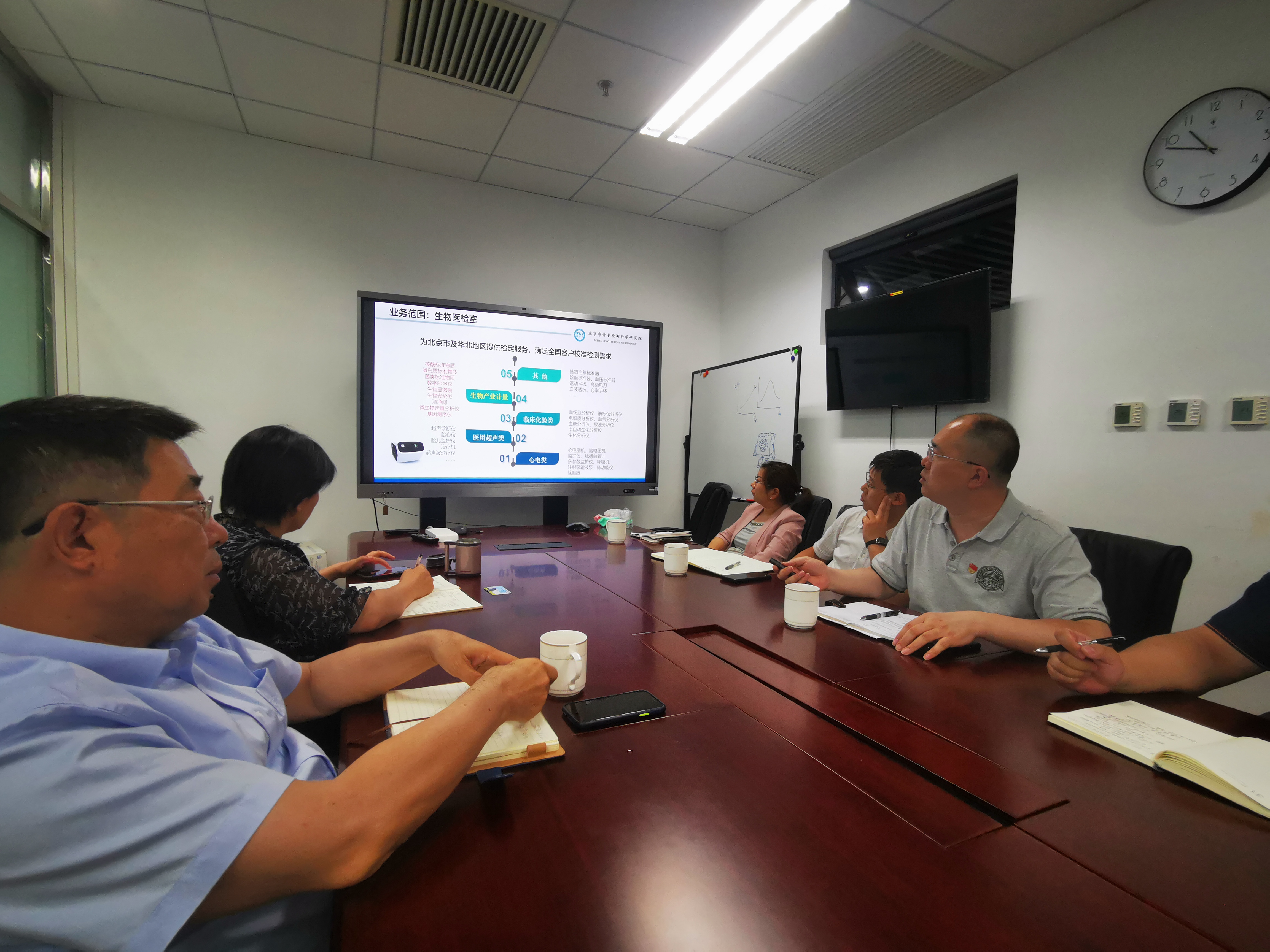 随后,双方人员在博远楼713会议室就今后的合作内容进行了具体座谈。闫江教授介绍了目前集成电路产业界的发展趋势及遇到的瓶颈与挑战,探讨了集成电路先进工艺。赵海波所长介绍了北京市计量检测科学研究院的整体情况,重点介绍了化学分析与生物医药所(化医所)的主要业务、具备的检测设备与科研项目情况。张静教授进一步讲解了学科在生物传感器制备及检测应用方面所作的工作及取得进展。