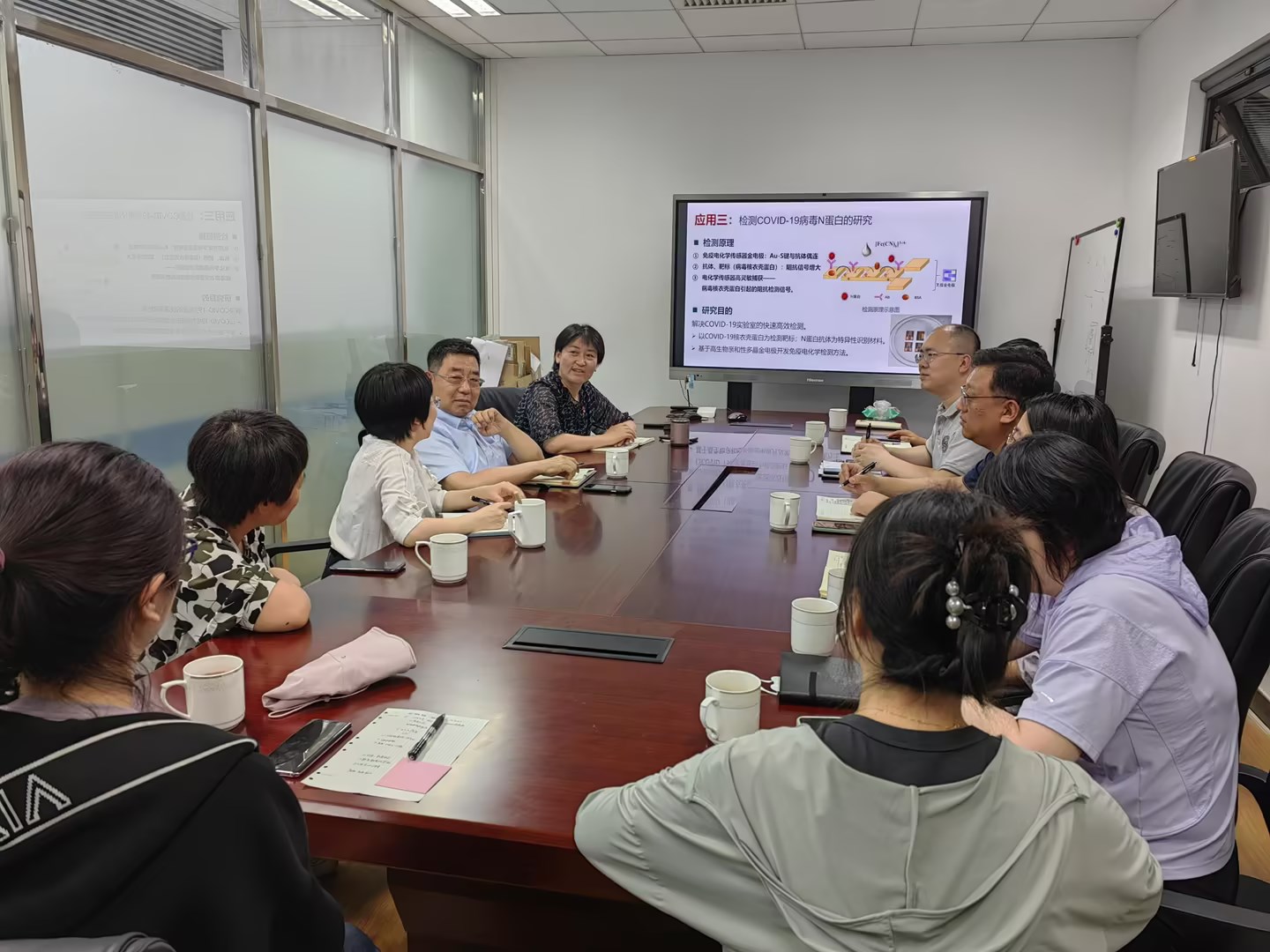在集体讨论环节,化医所梁俊梅、刘然博士就近期开展的关于石墨烯制备及表征方面科研项目问题进行了交流,探讨后期的科研合作事宜。最后,经过深入的交流和探讨,双方在人才培养、社会化服务、仪器设备的共享及科研开发等方面达成了合作意向,今后将逐步推进,将合作落实落地。